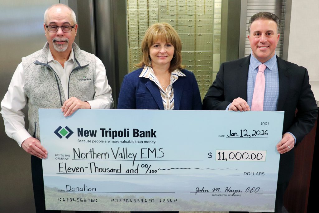 New Tripoli Bank donated $11,000 to the Northern Valley EMS, Inc. (NOVA) in recognition of the important role the organization serves in protecting the health and safety of the communities they serve. John M. Hayes, New Tripoli Bank President and CEO, presented a check to Jason J. Breidinger, NOVA Public Relations Co-Chair, and Kristie Wentling, NOVA Executive Director, at the Bank’s New Tripoli office on Monday.