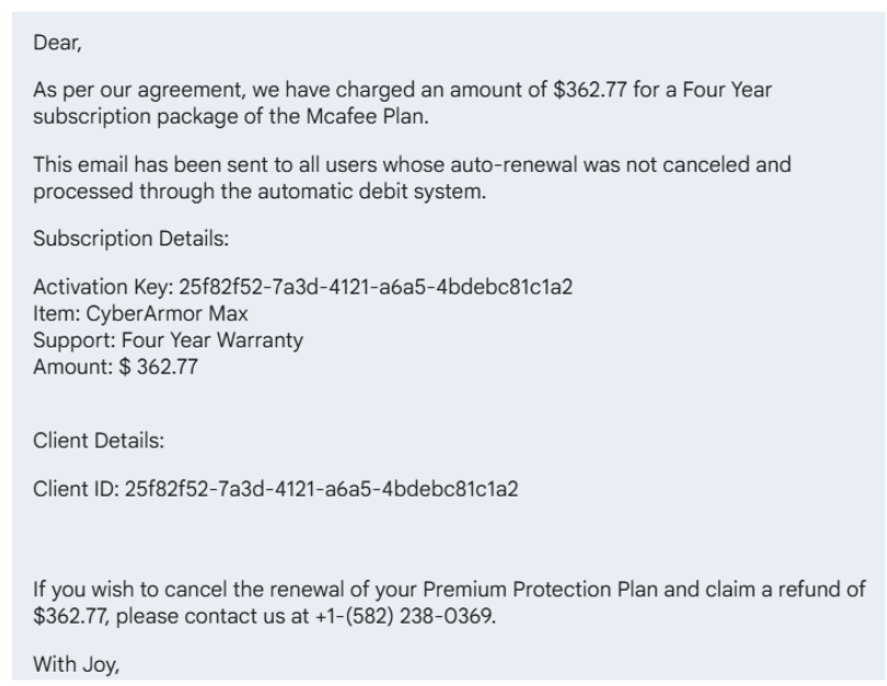 Attackers disguise their phishing lure as a harmless calendar event to get your attention. The attacker’s goal is to get you to contact them, where the real attack occurs. They will attempt to extract credit card details or login information if you call the phone number or click any links.