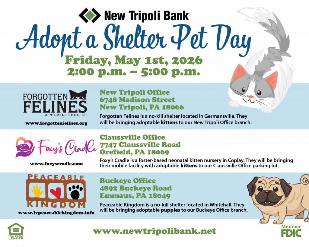 This year, we're not just doing a donation drive for our local pet shelters. New Tripoli Bank is excited to announce that we will be hosting adopt-a-pet events on Friday, May 1st to cap off our donation drive. We've invited Forgotten Felines, Foxy's Cradle, and Peaceable Kingdom to bring their adoptable pets to our branch offices from 2:00 - 5:00 p.m. Please make some time to bring your family to check out the fuzzy friends as well as bring some last-minute donations for the drive!